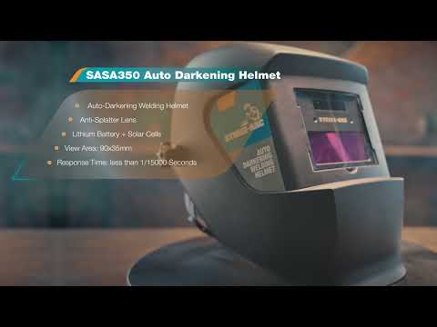 The SA350 Auto Darkening Welding Helmet in black offers reliable eye protection with an anti-splatter lens. Featuring a cartridge size of 110 x 90 x 9mm and a viewing area of 90 x 35mm, it provides clear visibility during welding tasks.
